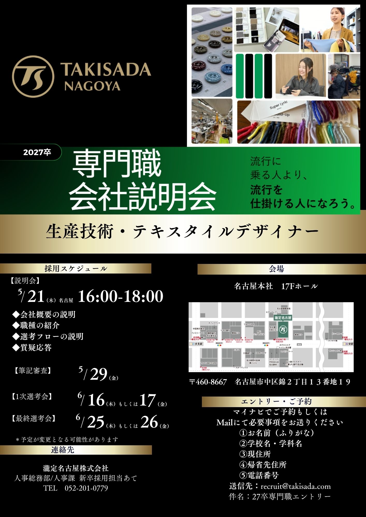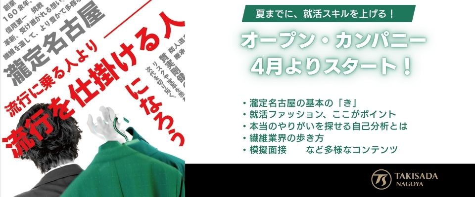 | 採用窓口 | 〒460-8667 名古屋市中区錦2-13-19 瀧定名古屋株式会社 人事課 TEL:052-201-0779(直通) |