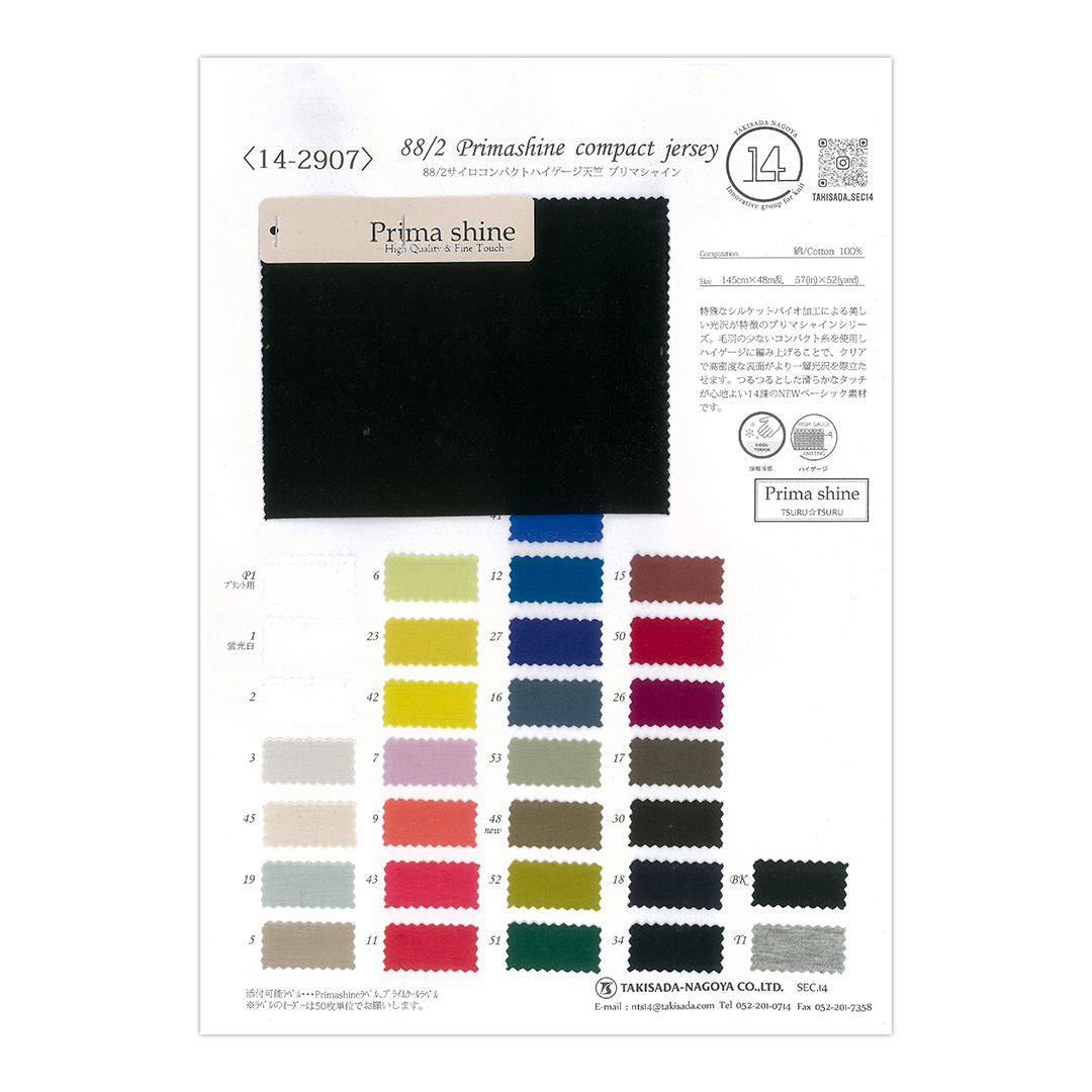 [ 14-2907 ] 88/2サイロコンパクトハイゲージ天竺 プリマシャイン Composition : 綿 / Cotton 100% Size : 145 cm × 48 m乱 # 接触冷感 / Cool Touch 綿本来の良さが引き立つ美しい光沢が特徴のプリマシャインシリーズ。 毛羽の少ない綿のコンパクト糸を使用し、ハイゲージで編み上げることに よりクリアでコンパクト、上品な艶という特徴をさらに際立たせました。 つるつるとした滑らかな肌触りで心地良い14課のこだわりNew Basic素材です。 お気に入りに追加 LINEで送る