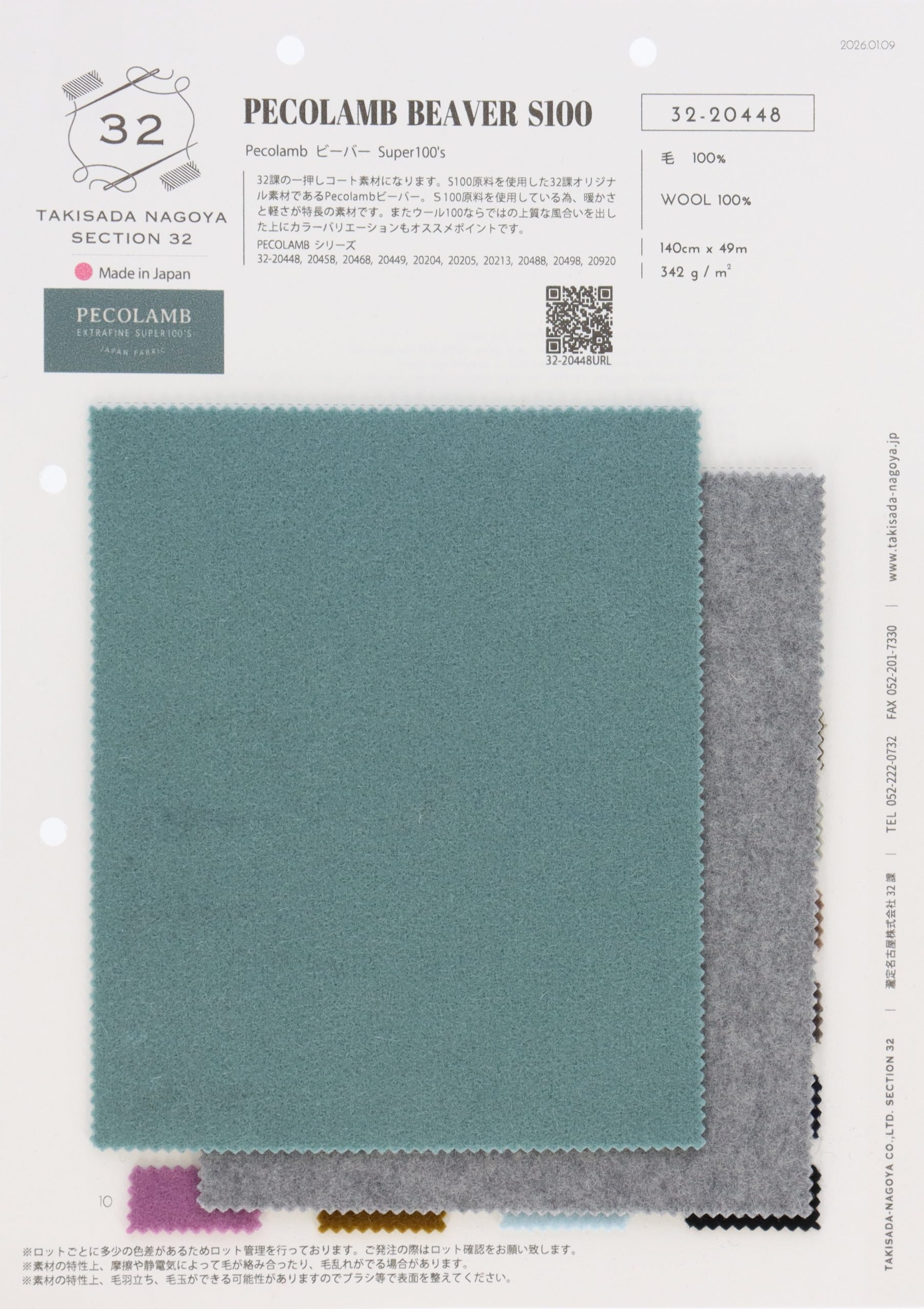 Section 32 strongly recommends this fabric for coats. Pecolamb Beaver, a Section 32 original made using SUPER 100 raw material. Using SUPER 100 raw material means the fabric is warm and light. Other recommended features include the high-quality texture you only get with a 100% wool fabric, and the wide range of color variations.