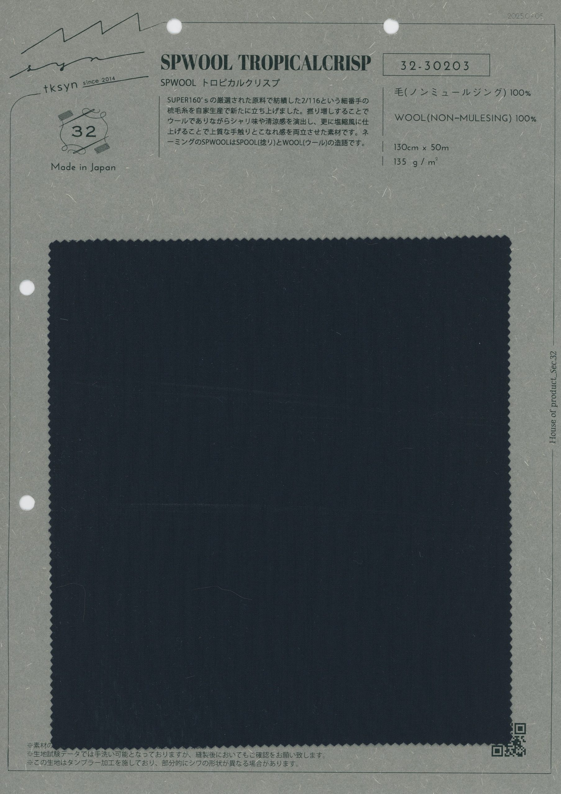 Spun with carefully selected Super 160's raw materials, this 2/116 count worsted fine yarn is a new release. Extra twisting creates a dry handle and refreshing feeling, and the finish is akin to salt shrunk fabric; this material feels high-quality yet looks effortless at the same time.