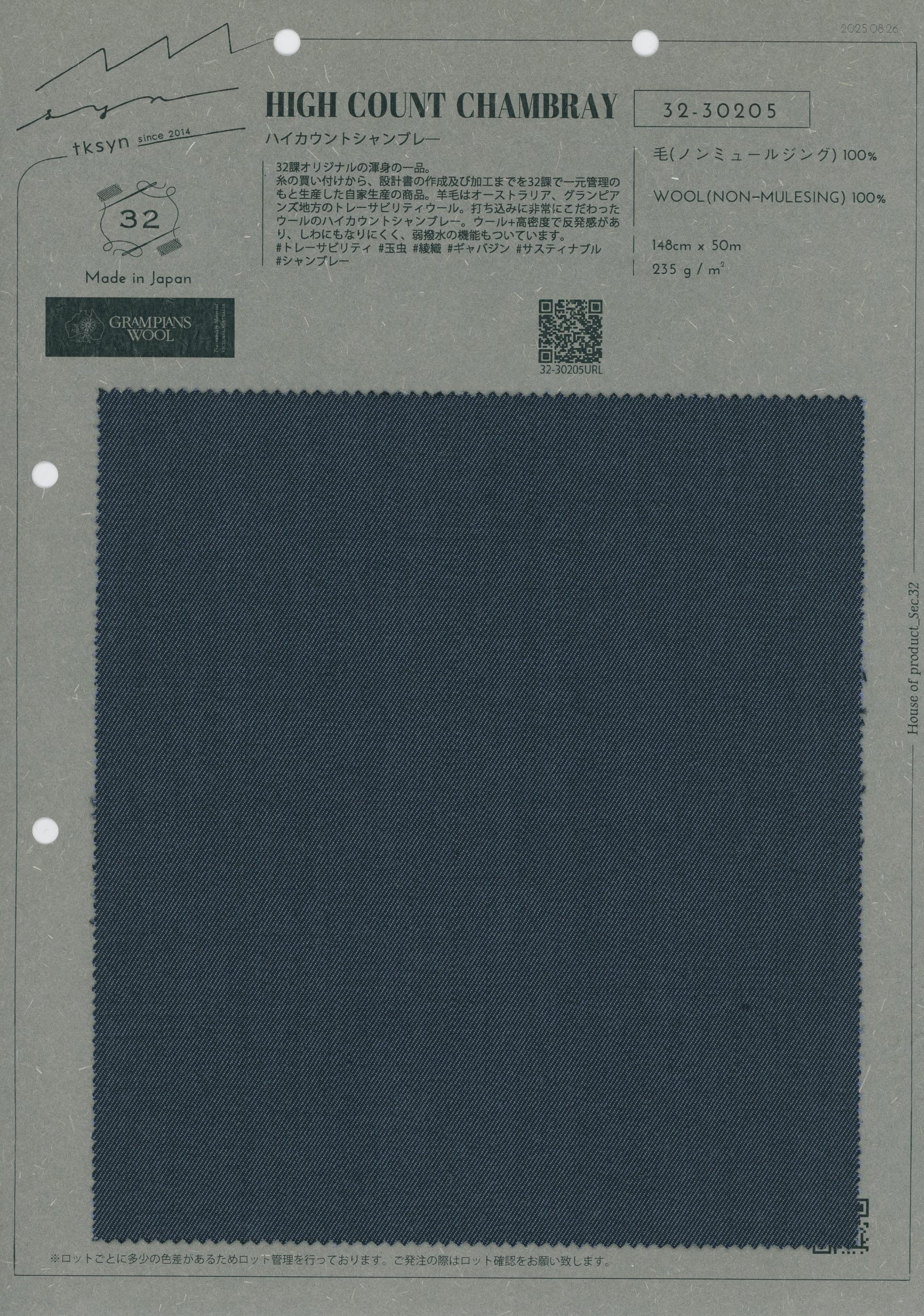 A Section 32 original masterpiece. This is a product Section 32 has produced entirely in-house, handling everything from purchasing the wool in Australia's Grampians region to the design and processing. It's a wool high-count chambray, and we've been extremely meticulous about the density. A high-density wool, it has resilience and is wrinkle-resistant and slightly water-repellent.