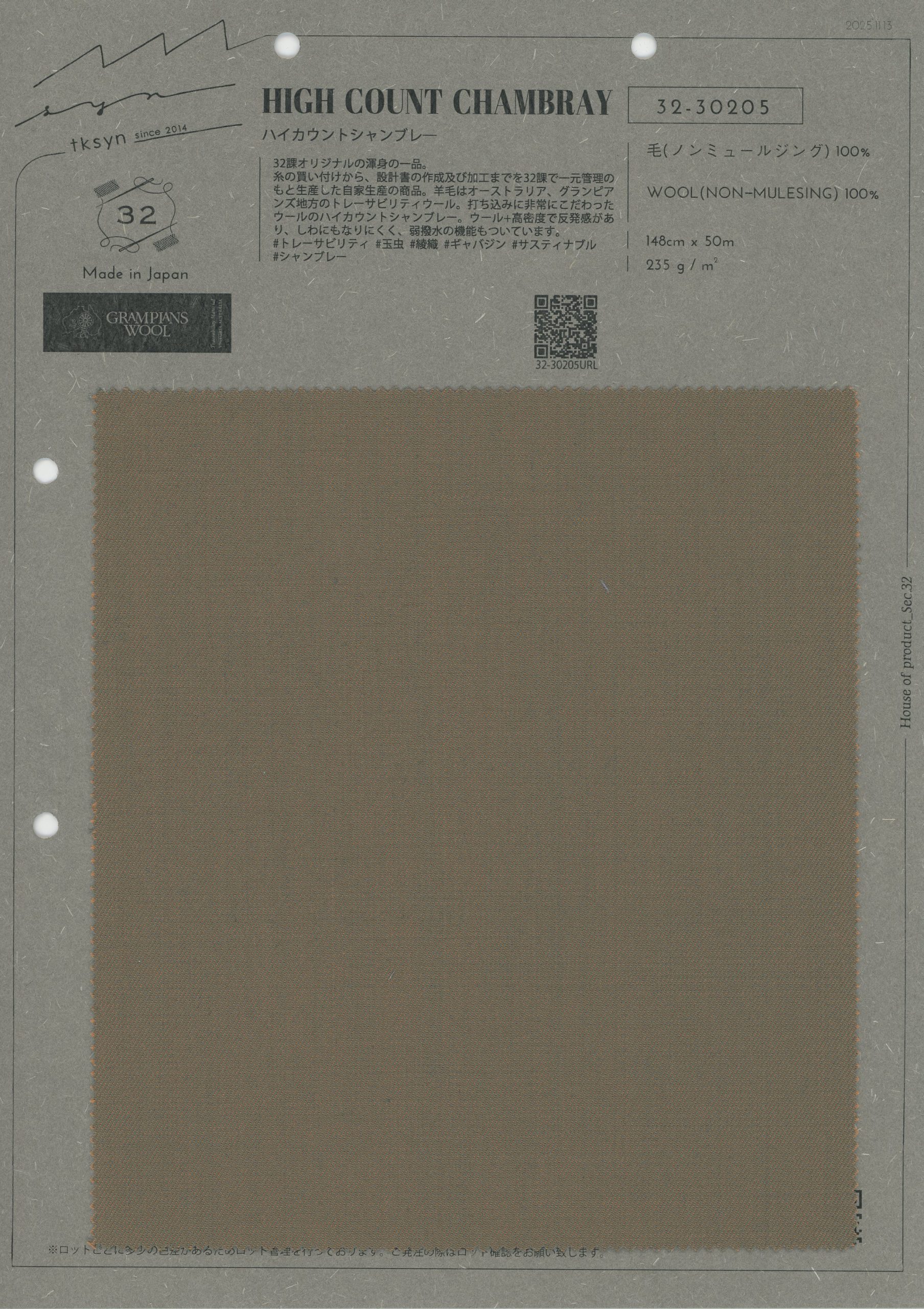 A Section 32 original masterpiece. This is a product Section 32 has produced entirely in-house, handling everything from purchasing the wool in Australia's Grampians region to the design and processing. It's a wool high-count chambray, and we've been extremely meticulous about the density. A high-density wool, it has resilience and is wrinkle-resistant and slightly water-repellent.