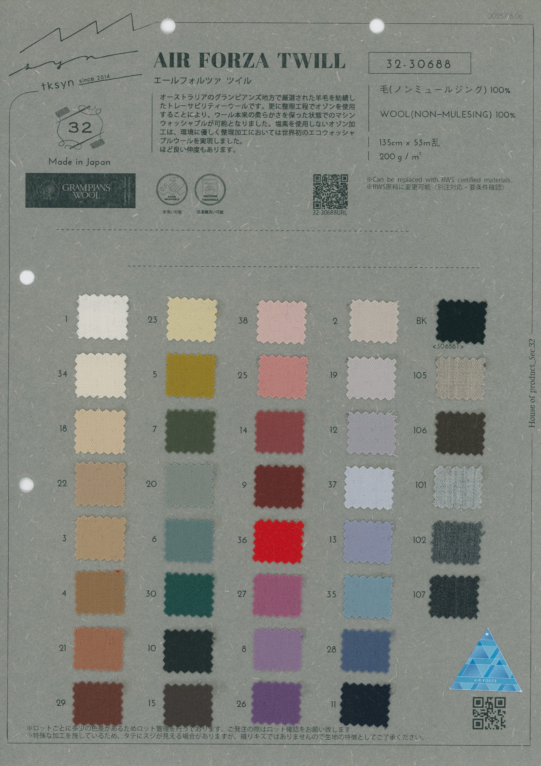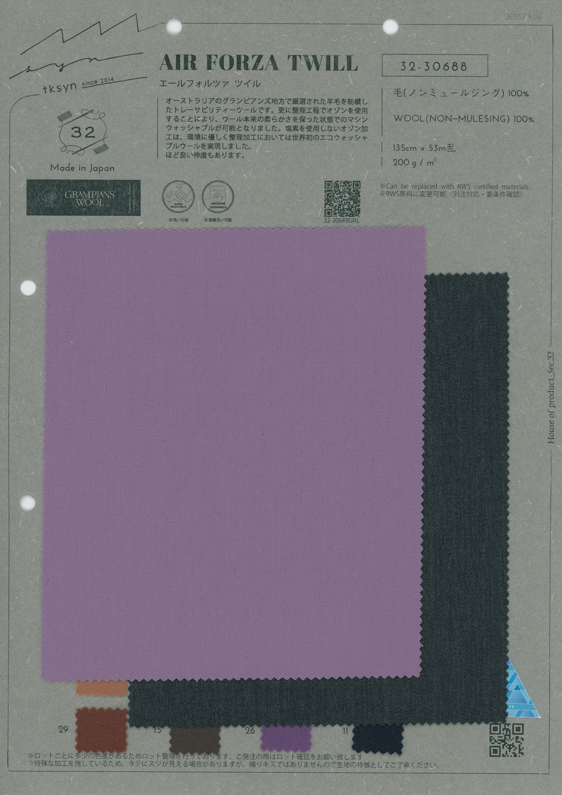 A stock-dyed woven fabric series made using 2/60 yarn in both the warp and weft. We use traceable wool made by spinning carefully selected wool from the Grampians region in Australia.Using ozone in the finishing makes it hand-washable while keeping the natural softness of wool. The ozone treatment doesn't use any chlorine, which means we've successfully created the world's first eco-friendly washable wool. It has good stretch.