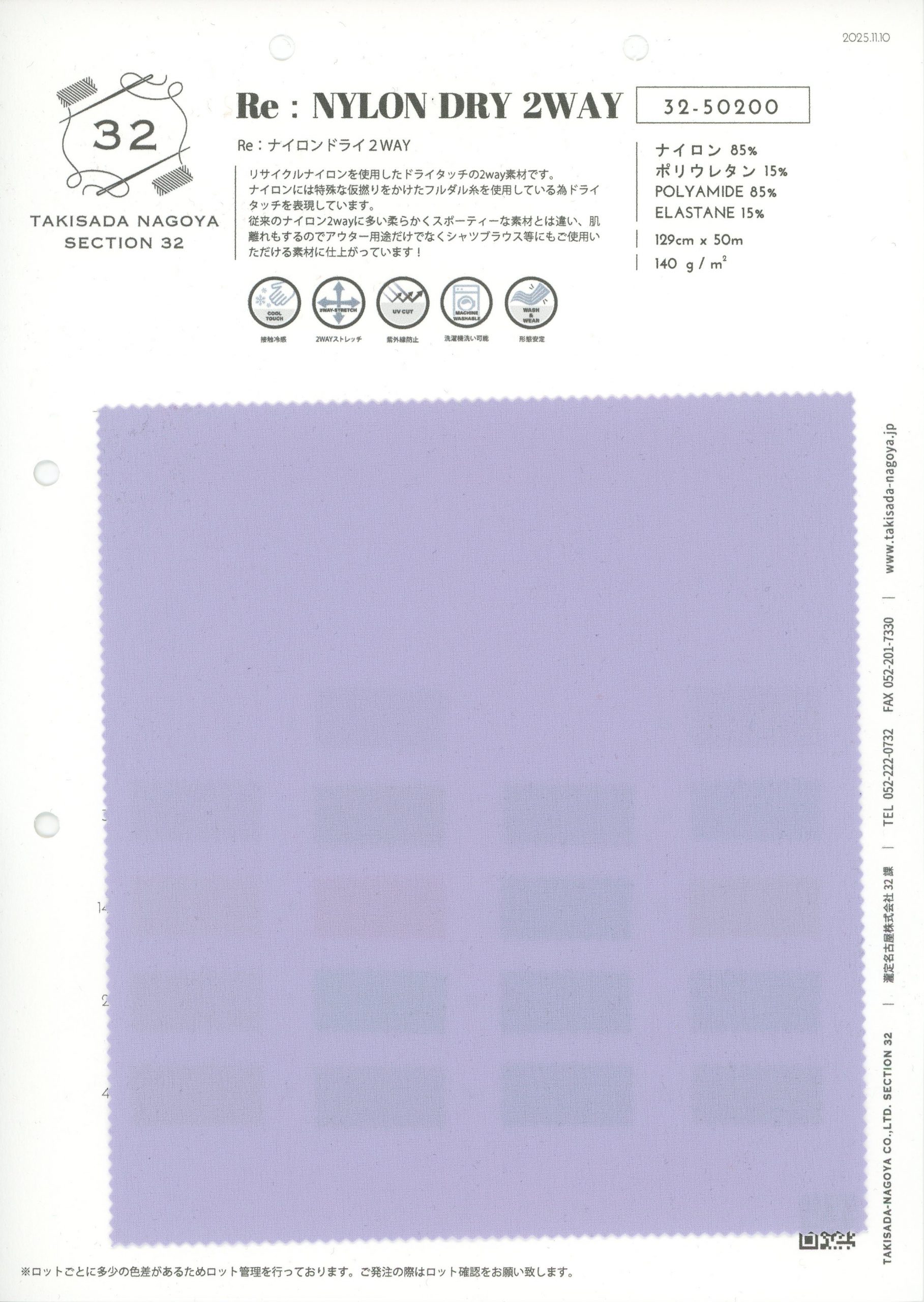 ナイロンでは珍しい仮撚りのフルダル糸を使用している為、ドライタッチに仕上がっています。従来のナイロン2wayに多い柔らかくスポーティーな素材とは違い肌離れもするので、アウター用途だけでなくシャツブラウス等にもご使用いただける素材です!