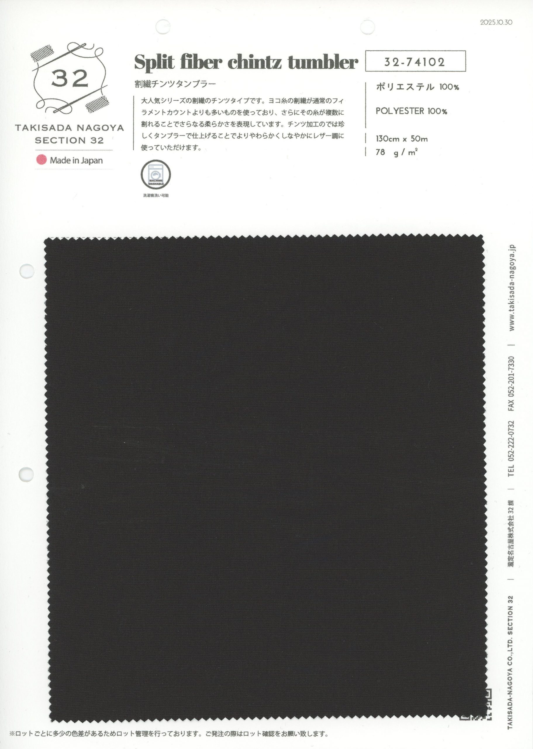 大人気シリーズ、割繊のチンツタイプが登場!ヨコ糸の割繊が通常のフィラメントカウントよりも多いものを使っており、その糸が複数に割れることでさらなる柔らかさを表現しています。チンツ加工後にタンブラー仕上げを施すことで、よりやわらかくしなやかなレザー調素材になっています。