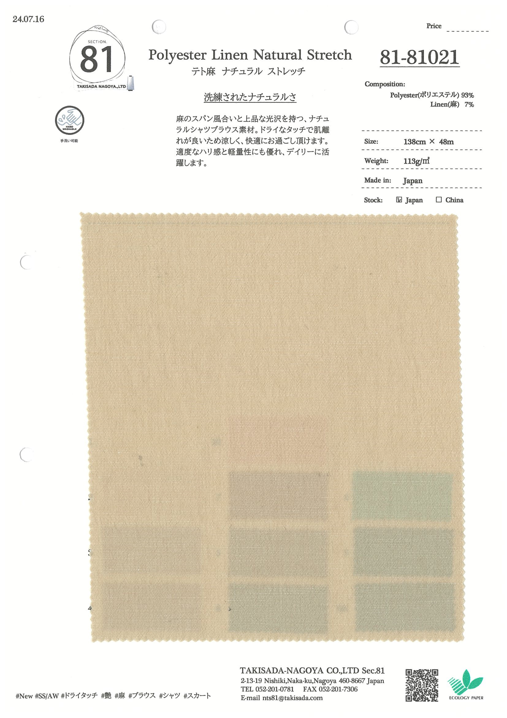 麻のスパン風合いと上品な光沢を持つ、ナチュラルシャツブラウス素材。ドライなタッチで肌離れが良いため涼しく、快適にお過ごしいただけます。適度なハリ感と軽量性に優れ、デイリーに活躍します。